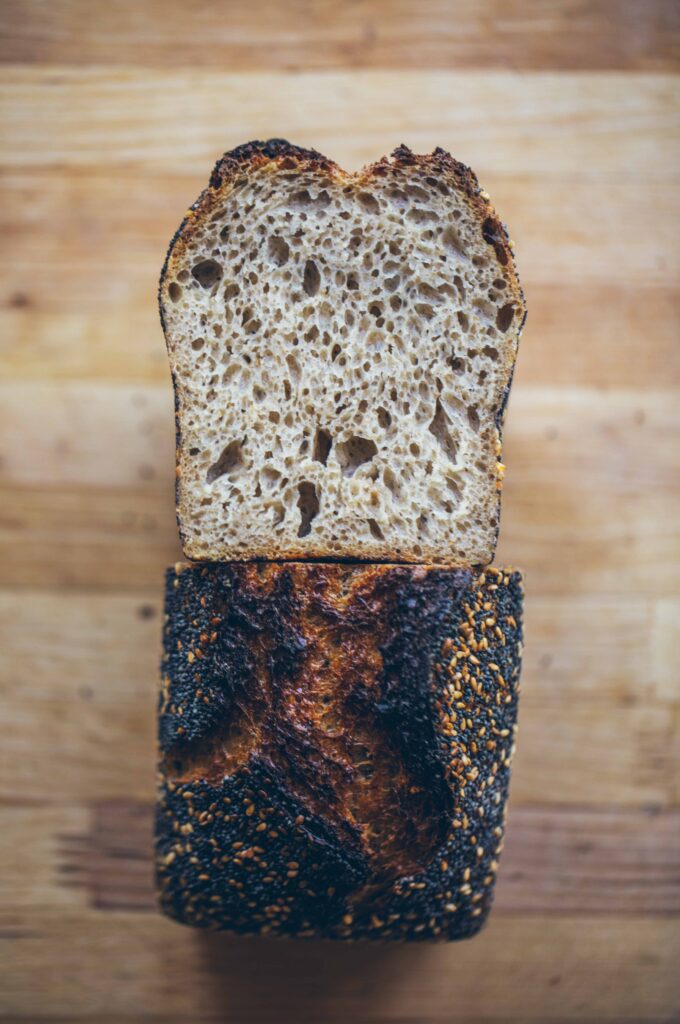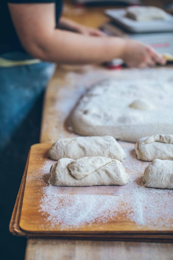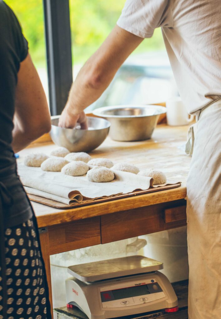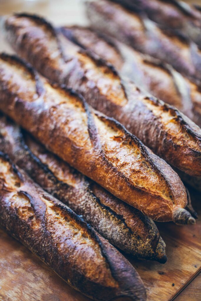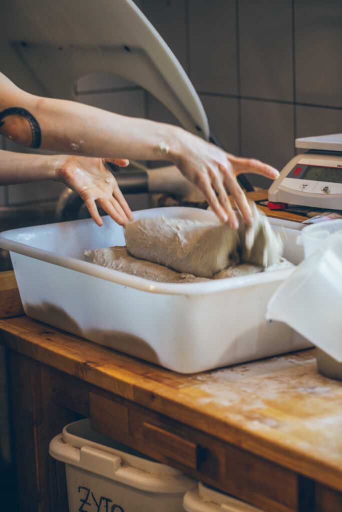 Wszystkie mąki, których używamy w piekarni pochodzą z polskich upraw. Wszystkie nasze chleby są na zakwasie, jedynie bagietki i chałka mają niewielki dodatek drożdży. Charakterystyką naszych wypieków jest wydłużona fermentacja. Oznacza to, że na pewnym etapie ciasto jest drastycznie schłodzone, dzięki czemu w chlebie zachodzi szereg reakcji, które znacząco wpływają na jego smak i strawność. Charakterystyczna ciemna, cienka skórka jest oznaką udanej fermentacji, a miękki miękisz jest pełen składników odżywczych, które nasz organizm bardzo łatwo trawi.